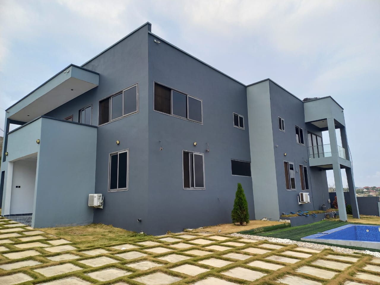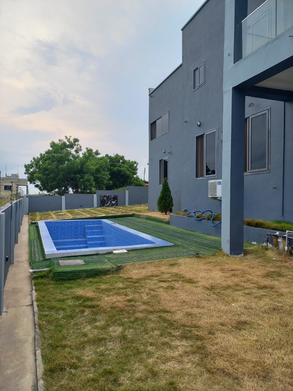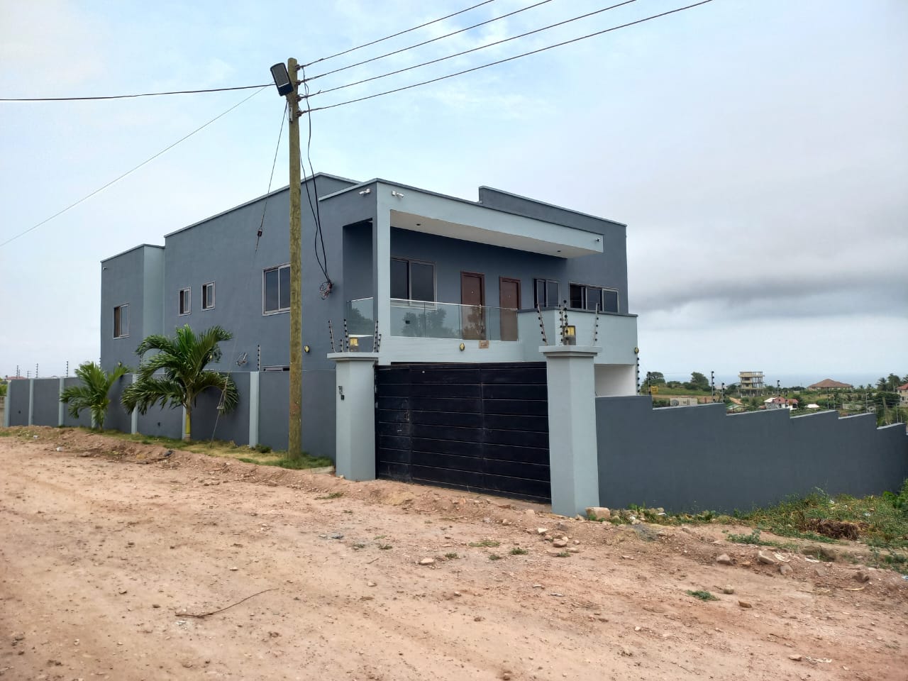 This 6 bedroom self compound at Kokrobite, is for sale. It is located in a serene neighbourhood with good road networks, and also easily accessible. Kokrobite Hills with very nice views to the beach and views to the city. Very nice homes built in the neighborhood (2 mansions) .1 minute walk to booth. This 6 bedroom house comes with a swimming pool ,roughly 36** sqft ,AC unit in each room ,Electric Security fence ,Camera system .Solar panels for lights in case of power outage.